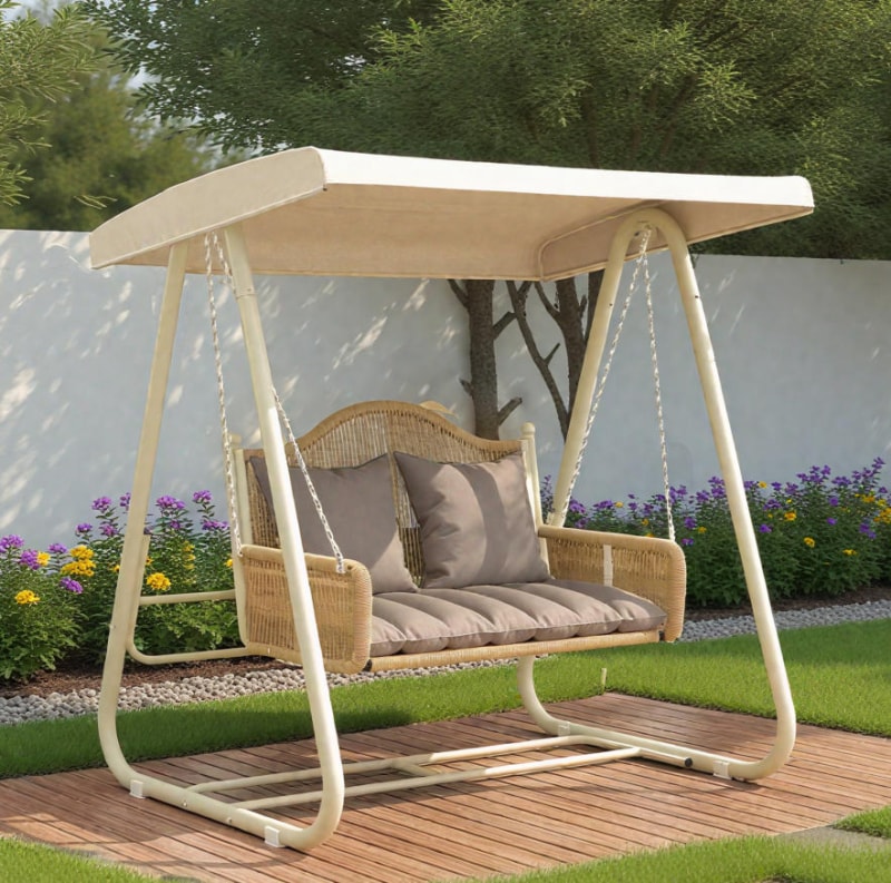 Crafted for everyday outdoor life, the frame finish is corrosion-resistant and the rattan weave is UV-stabilized to reduce fading. Cushion covers are zippered for easy washing and come in quick-dry fabrics for humid climates. Thoughtful engineering — reinforced welds, oversized base feet, and redundant attachment points — ensures durability without a heavy visual footprint. Whether you’re furnishing a family patio, poolside cabana, or garden nook, this two-person swing creates a social focal point that’s both practical and photogenic.
