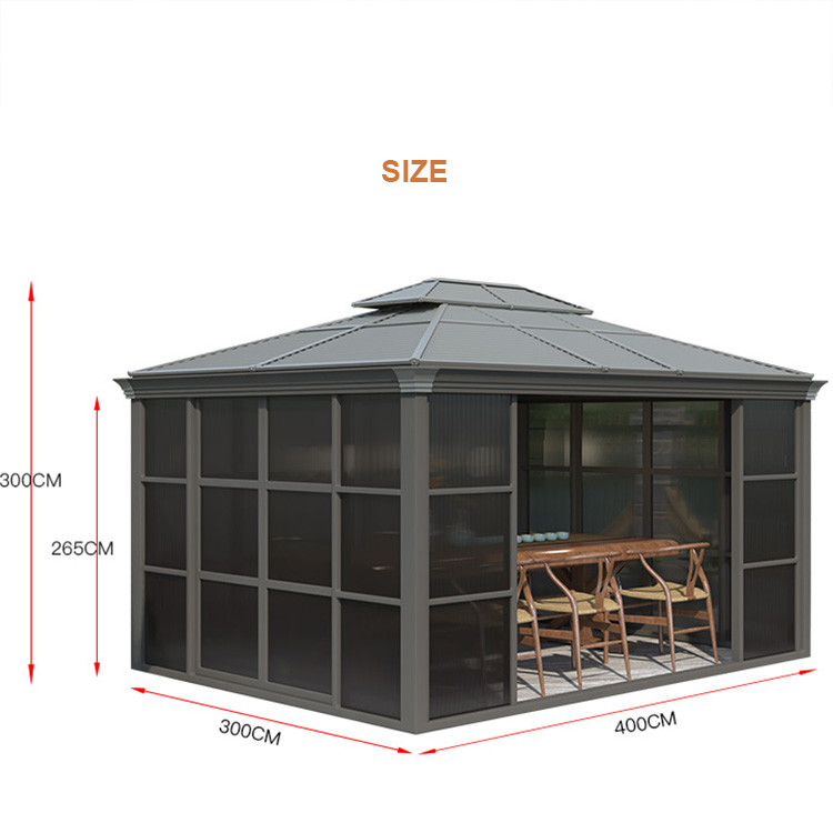 Elevate your outdoor living space with this 3×4m Luxury Gazebo House—a sophisticated blend of elegance and functionality, perfect for gardens, patios, or resort terraces. Crafted with premium, weather-resistant aluminum, it boasts a sturdy frame and durable canopy that shields from sun, wind, and light rain, ensuring year-round comfort. The integrated sliding doors add a touch of luxury while offering flexible enclosure: slide open for airy ventilation or close for privacy and protection. Spacious enough to accommodate outdoor dining sets, lounge furniture, or a cozy seating nook, it transforms any backyard into a refined retreat for entertaining guests or relaxing in style. With its timeless design and high-end finishes, this gazebo house is the ultimate upgrade for luxury outdoor living.