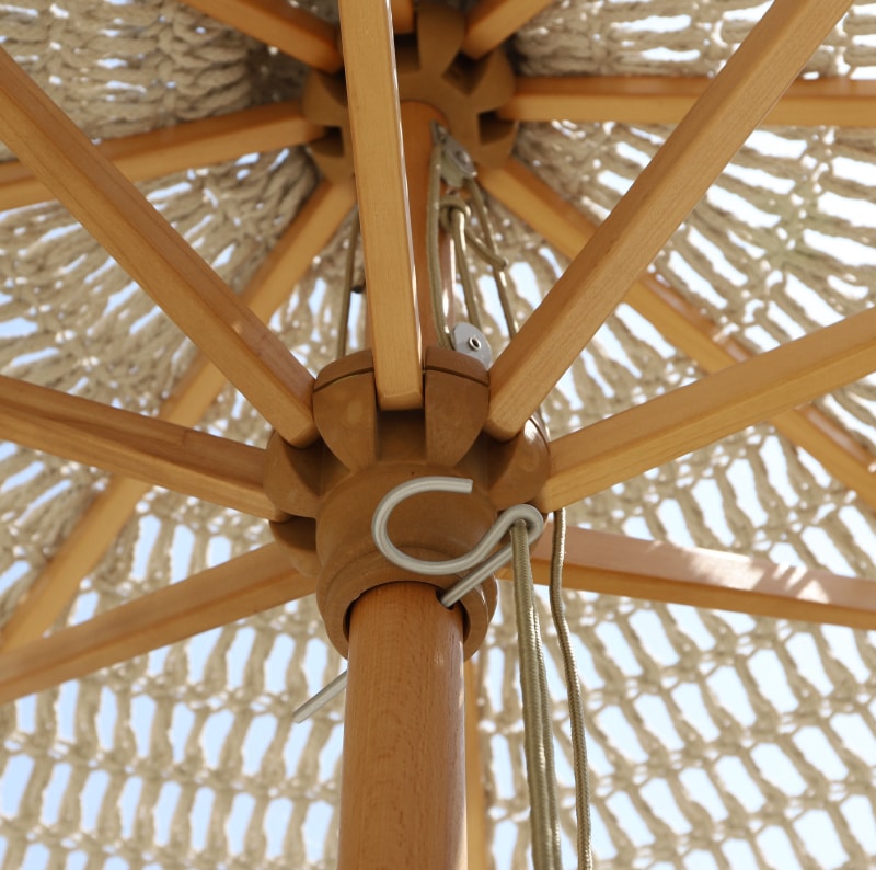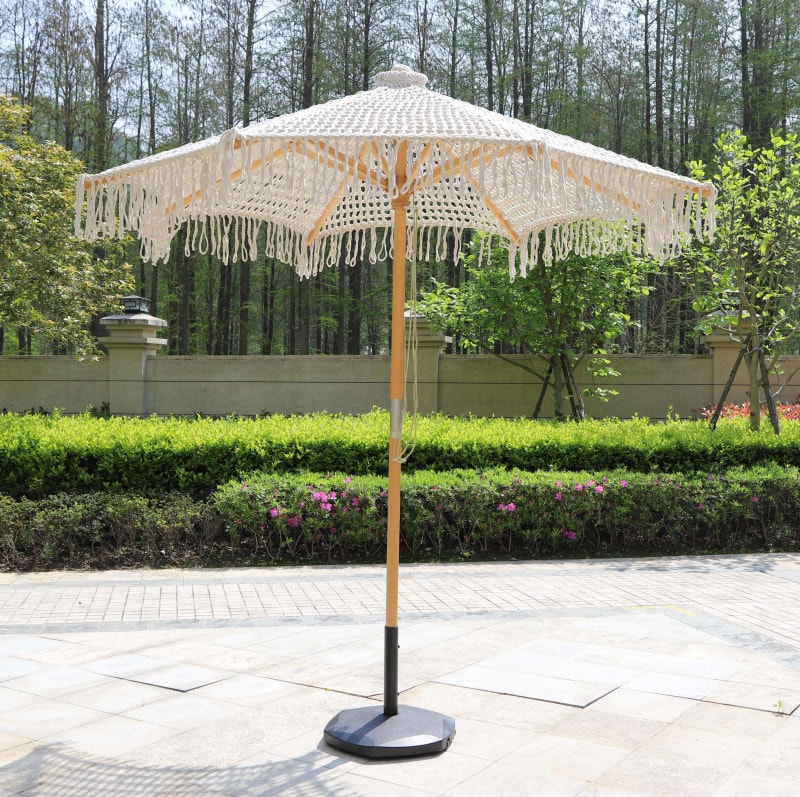 Elevate Your outdoor spaces with our Boho White Macrame Outdoor Wood Umbrella, a 2.5M round piece blending modern design with bohemian charm. Its canopy features handwoven cotton-polyester rope, crafted into delicate patterns, plus tassel fringe for a soft, beachy vibe. The frame uses durable beech wood: a 48mm diameter pole ensures stability, matching the modern style that fits hotels, villas, parks, or courtyards.