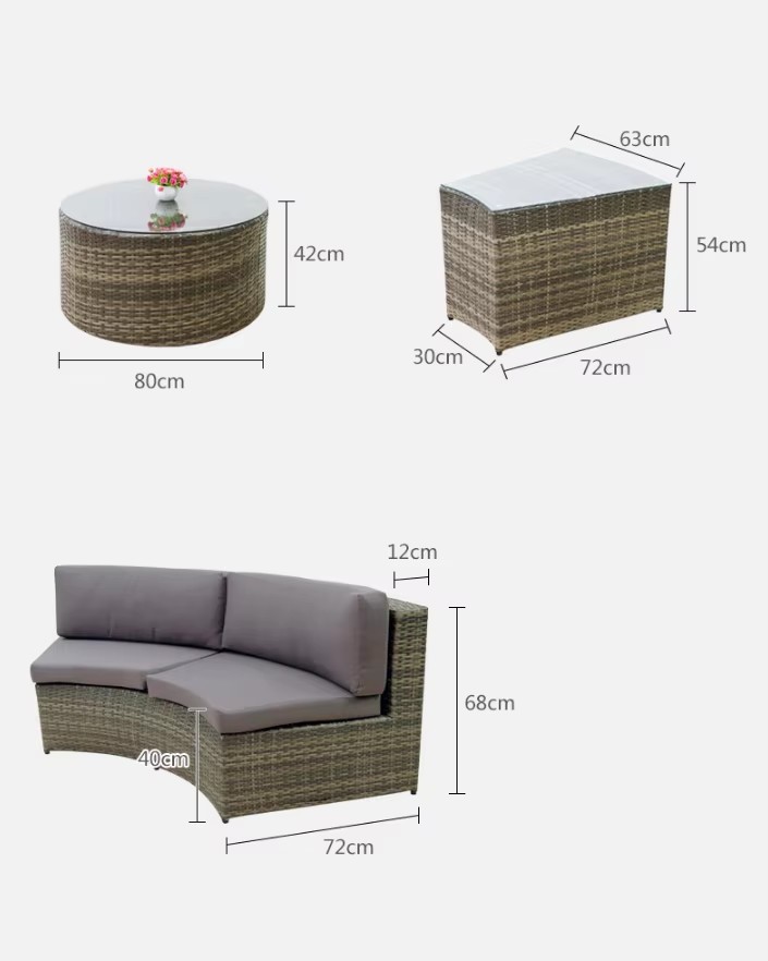 | Dimension Details | – Single sofa module: 72cm×72cm×68cm (seat height 40cm, arm width 12cm)- Full circle set: 300cm diameter- round coffee table: 80cm×42cm- Side storage box: 72cm×30cm×54cm (63cm top width) |