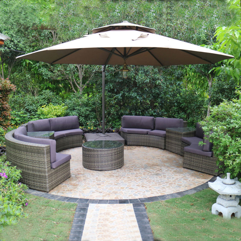 Villa Garden Gathering: Assemble the 300cm full circle rattan sofa set with the round coffee table, paired with our large cantilever umbrella, creating a central lounge area for family parties or friend gatherings, (matches luxury garden decor).